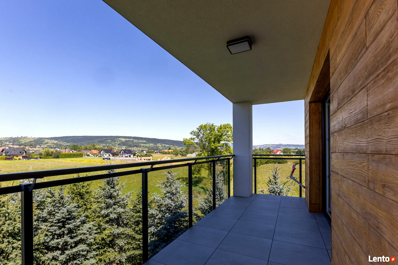 Duży balkon z widokiem na Beskid Sądecki.