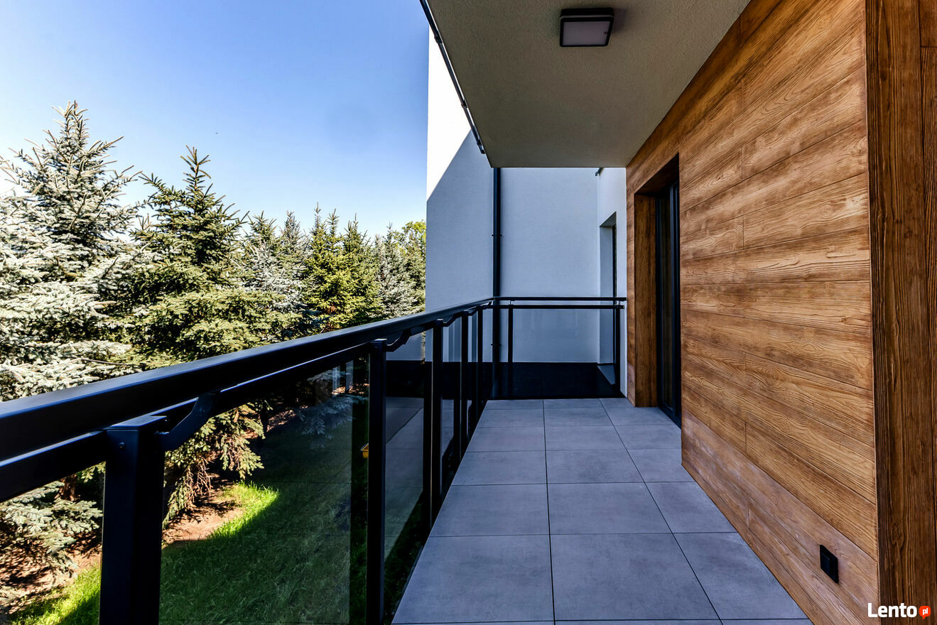 Z salonu wyjście na przestronny balkon z widokiem na zieleń.
